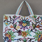 インド製 素材 コットン100% サイズ H25×W40×D10cm ハンドルの立ち上がり 約12cm インド、カシミール地方より 伝統的なチェーンステッチのバッグが届きました。 バッグ自体のお色がシンプルなホワイトなので、 カラフルな刺繍がより際立ち、綺麗です。 丁寧に、一針ずつ刺繍するのは とても手間の掛かる作業です。 職人たちの技術の高さが伺えます。 バッグは横長の使い勝手の よいサイズ感です。 内側にはポケットも付いているので、 スマホなどの収納も便利です。 バッグなのに、芸術品を見ているかのような 感覚になる、綺麗な刺繍が素敵です。 普段使いに丁度良いサイズで、 プレゼントにも喜ばれそうです。
