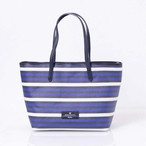 NATALI。ホワイトのボーダーが引き立つ軽いトートバッグ。とても使いやすい大きさの初夏にぴったりなアイテム。持ち手は牛革。内側はストライプの裏地、ファスナー付きポケット。サイドにボダン付きで、ボストン風にカタチを変えられるデザインです。