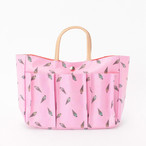 メンズライクなカモフラ柄を淡いパステルカラーと、ほんのりラメをのせた素材でおつくりして女性らしく仕上げました。かっちりしたスクエア型で底マチもついているのでたっぷり収納できます。